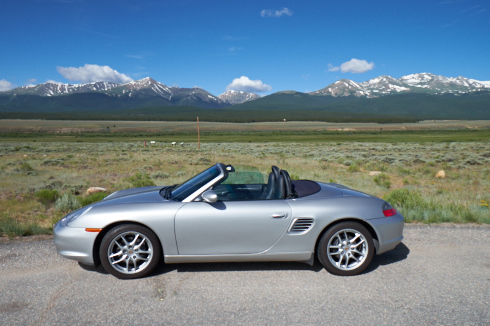 Looking at the Porsche with Mt Elbert and Mt Massive in the background